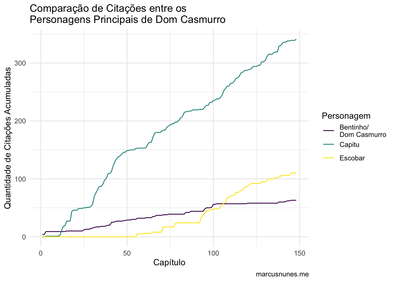 Como exercício de programação, decidi verificar quantas citações cada um dos três personagens principais de Dom Casmurro (Bentinho, Capitu e Escobar) tiveram em cada capítulo da obra. A ideia é contar as ocorrências de cada nome em cada capítulo e, a partir disso, fazer o somatório geral desses valores.