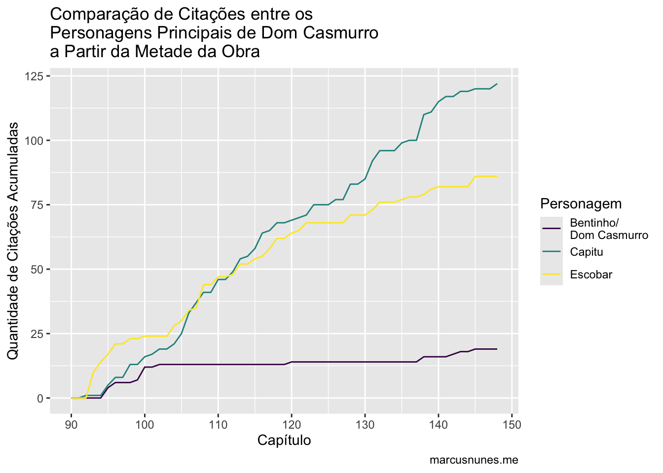Claramente, Capitu é a personagem mais citada, o que não é um absurdo imaginar. Mas note como próximo ao capítulo 100 há um salto no número de citação de Escobar. Se refizermos o gráfico a partir do capítulo 90, Capitu e Escobar possuem um número de citações bem similar.