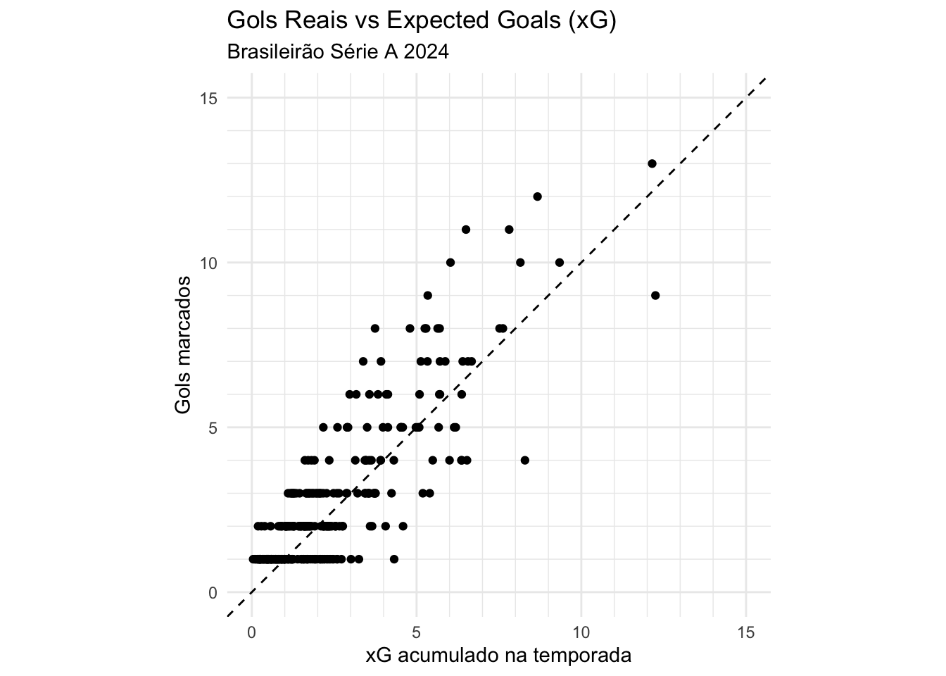 O gráfico abaixo plota os gols marcados (eixo Y) contra o xG acumulado (eixo X). A linha tracejada representa a reta de igualdade perfeita (gols = xG): jogadores acima dela marcaram mais do que o esperado; abaixo, menos. Quanto mais distante da diagonal, mais extremo é o desempenho relativo ao modelo estatístico.